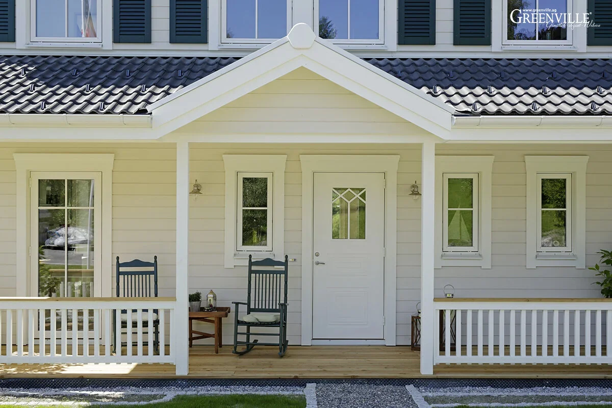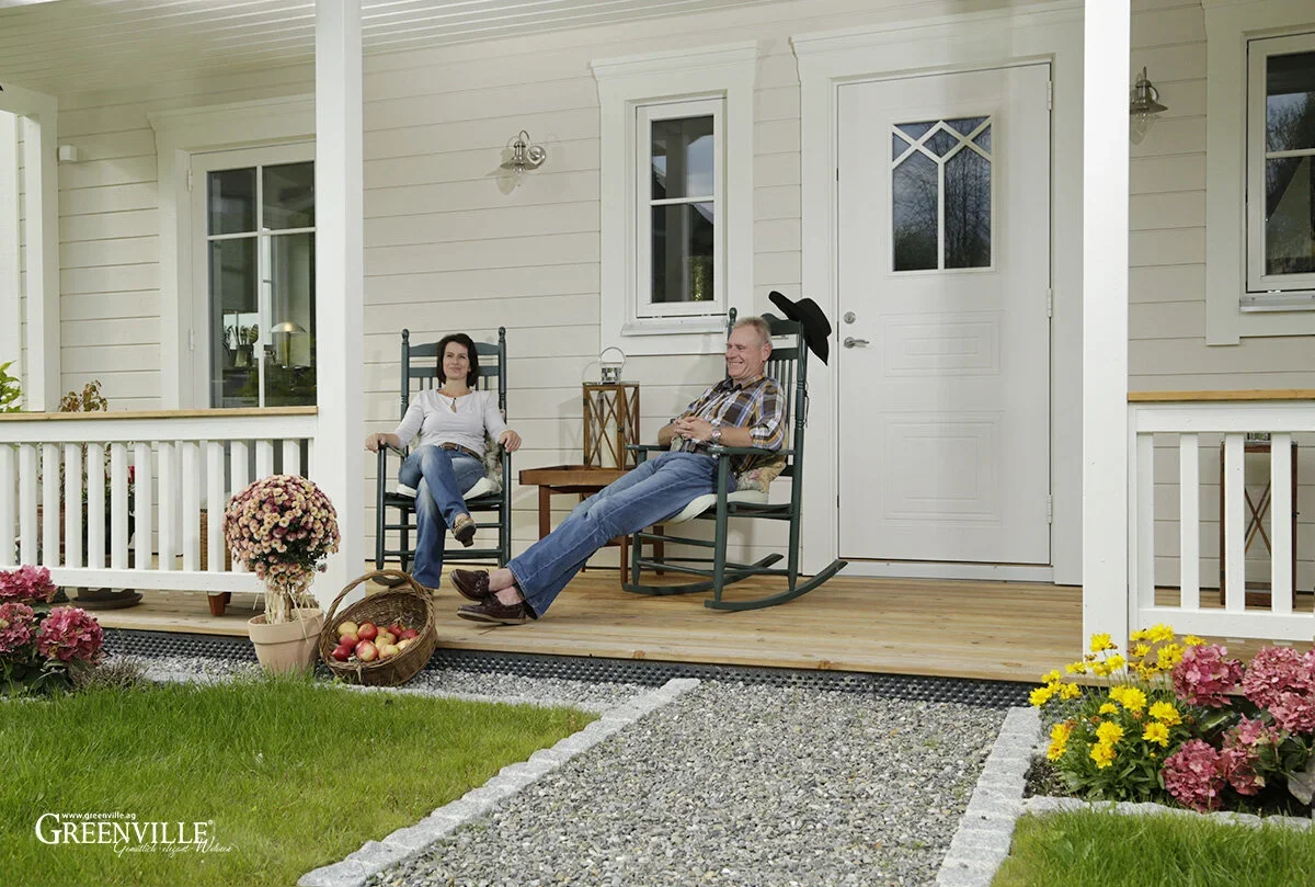 Wenn unsere Bauherren in ihren original amerikanischen Schaukelstühlen auf der Veranda ihres Holzhauses sitzen und die Abendsonne genießen, könnte das genauso gut in Vermont oder New Hampshire sein. Ist es aber nicht. Wir sind in einem kleinen Ort wenige Kilometer entfernt vom Bodensee.